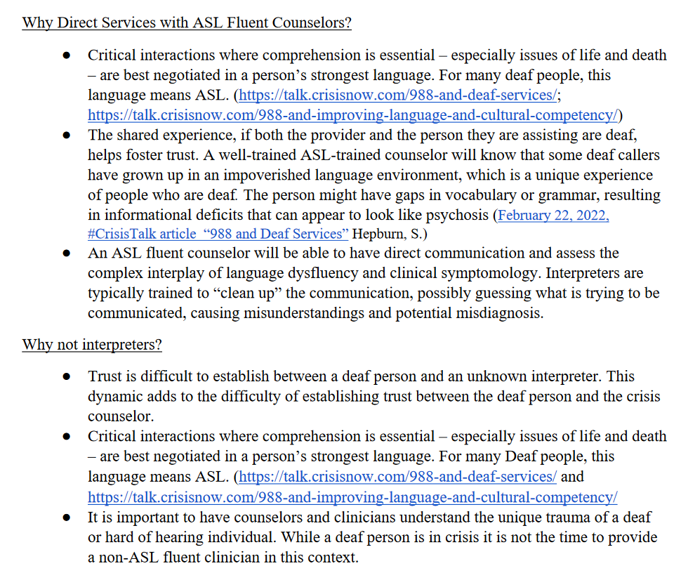 (Above) Paper on Effective Communication for Deaf People Experiencing a Crisis https://users.neo.registeredsite.com/2/1/4/12973412/assets/NASMHPD_Recommendations_on_988_and_Deaf_Crisis_Services.pdf