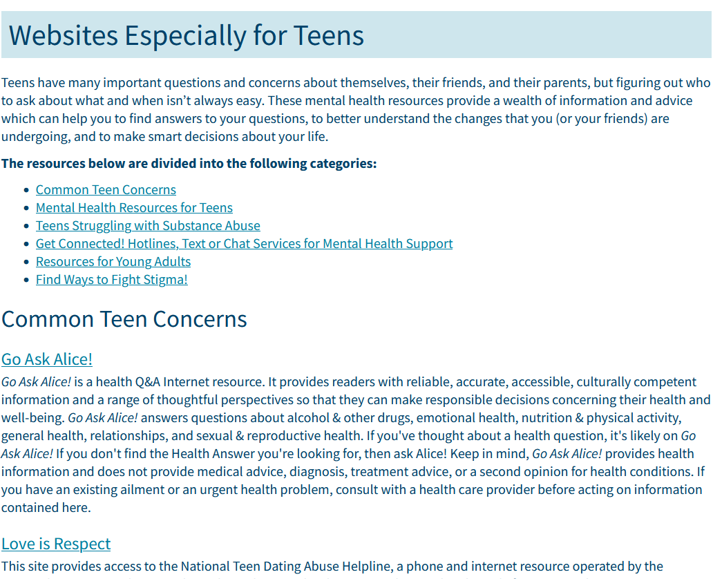 - TEEN mental health resources : https://interface.williamjames.edu/guide/websites-especially-teens